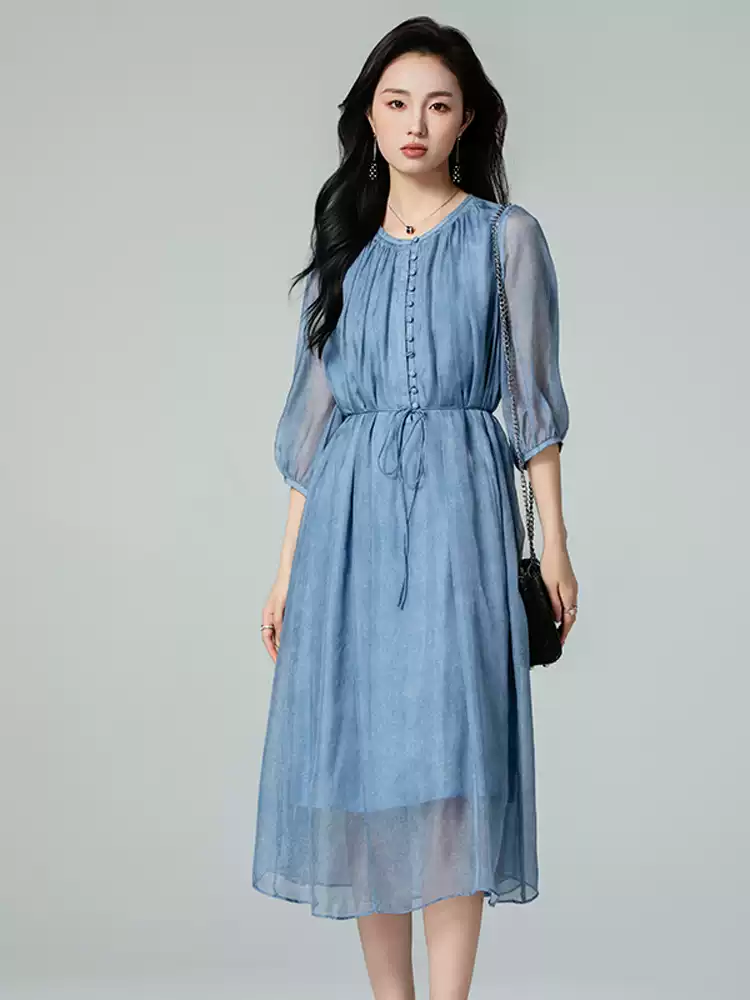2025夏新款真丝连衣裙桑蚕丝女高端气质轻奢高级感大牌蓝色中长款