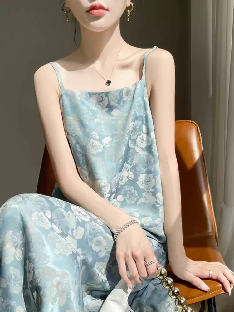 新中式醋酸缎面真丝吊带连衣裙女2025年夏季新款国风提花打底长裙