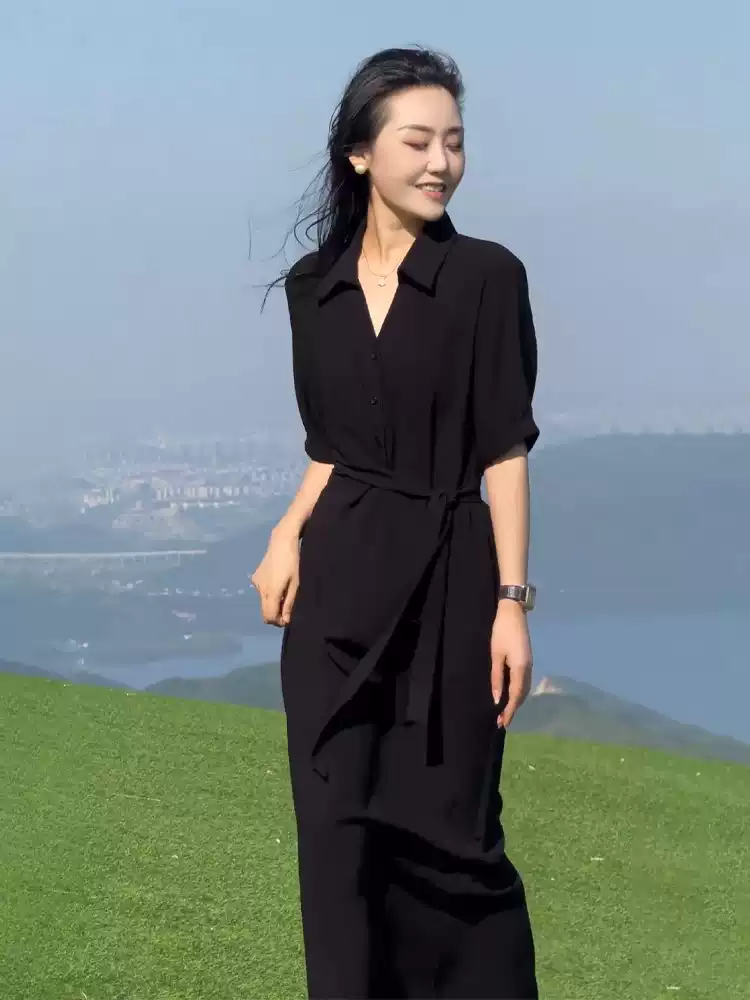 25春夏新品无袖腰带荡领中长款淡人连衣裙