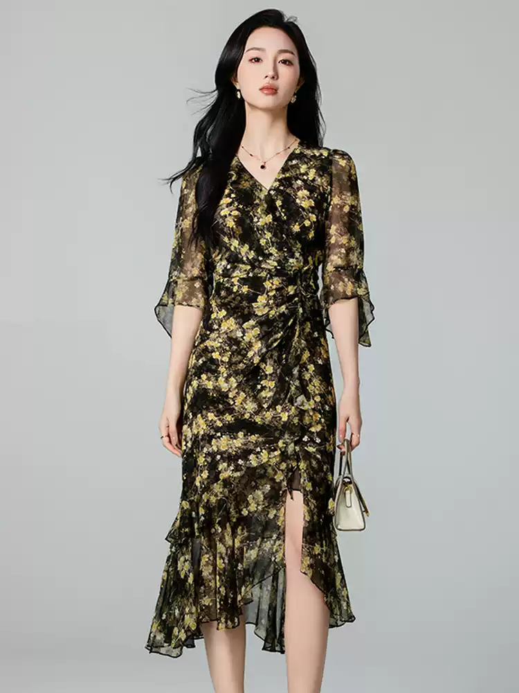 真丝连衣裙桑蚕丝2025夏季新款女装高端气质显瘦鱼尾开叉中长裙