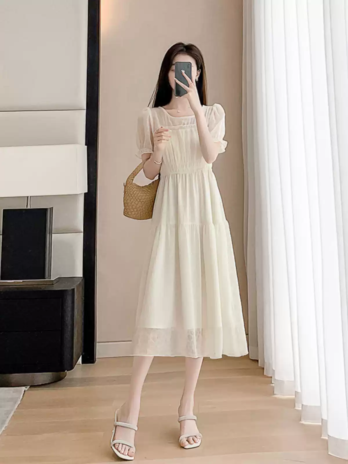 法式白色雪纺连衣裙女夏季高级感减龄休闲温柔风a字裙子