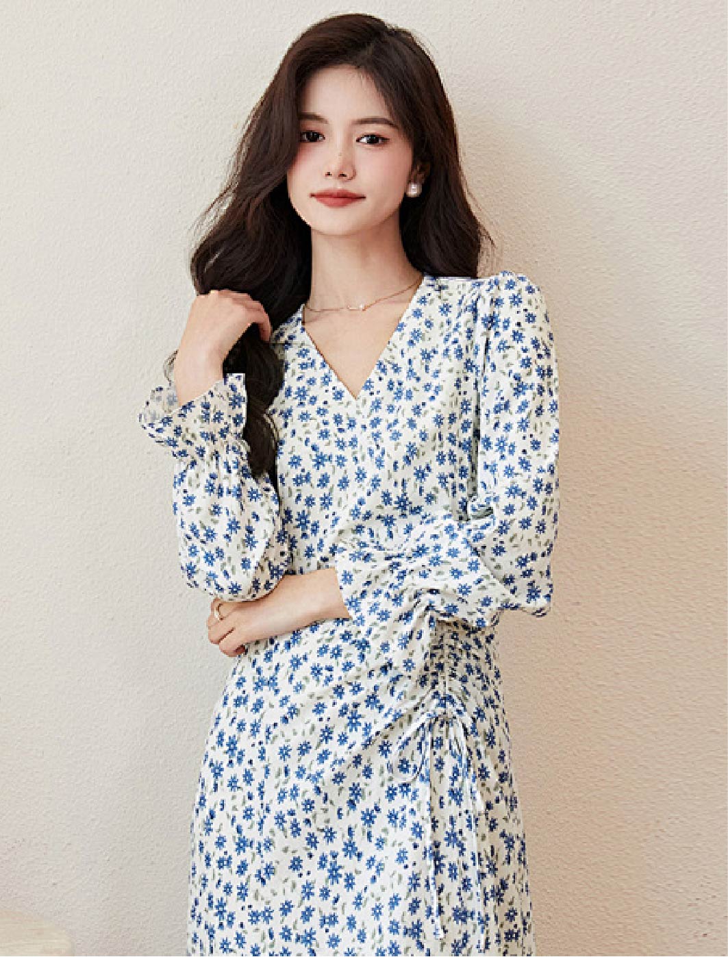 夏季新款显瘦v领气质a字裙设计感长裙女短袖法式碎花连衣裙女