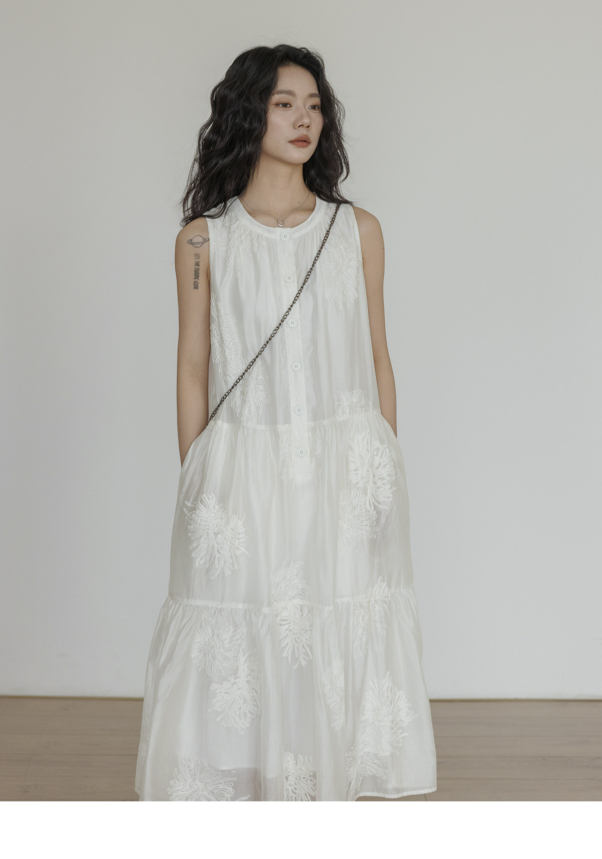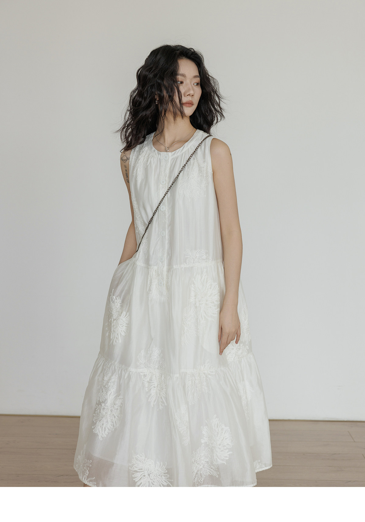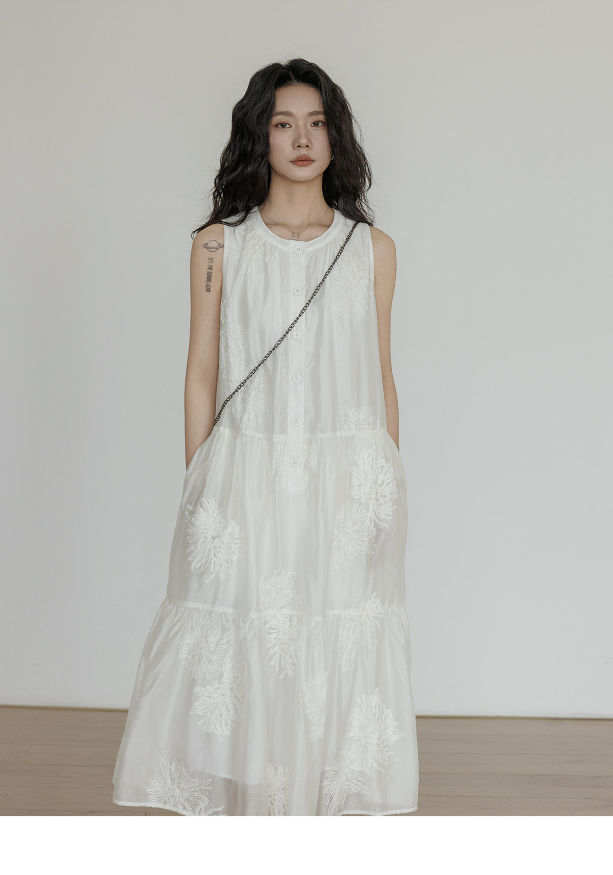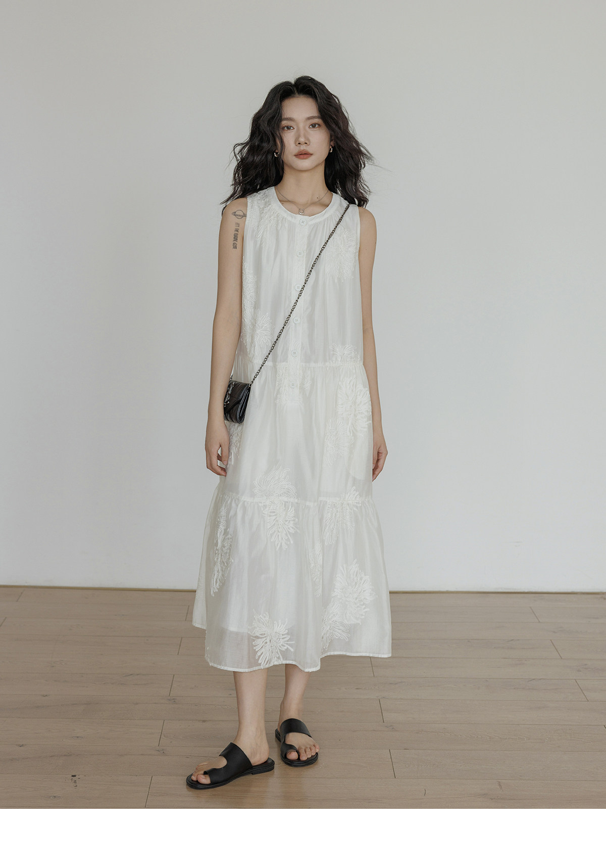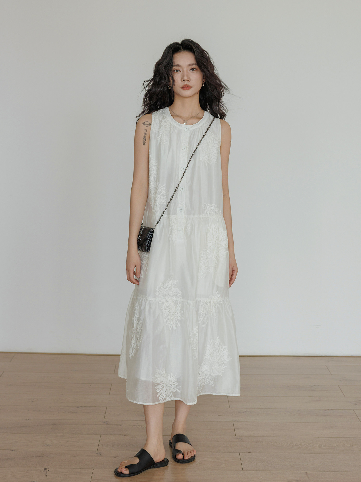 刺绣设计感新款慵懒宽松休闲度假长裙女圆领无袖背心连衣裙女