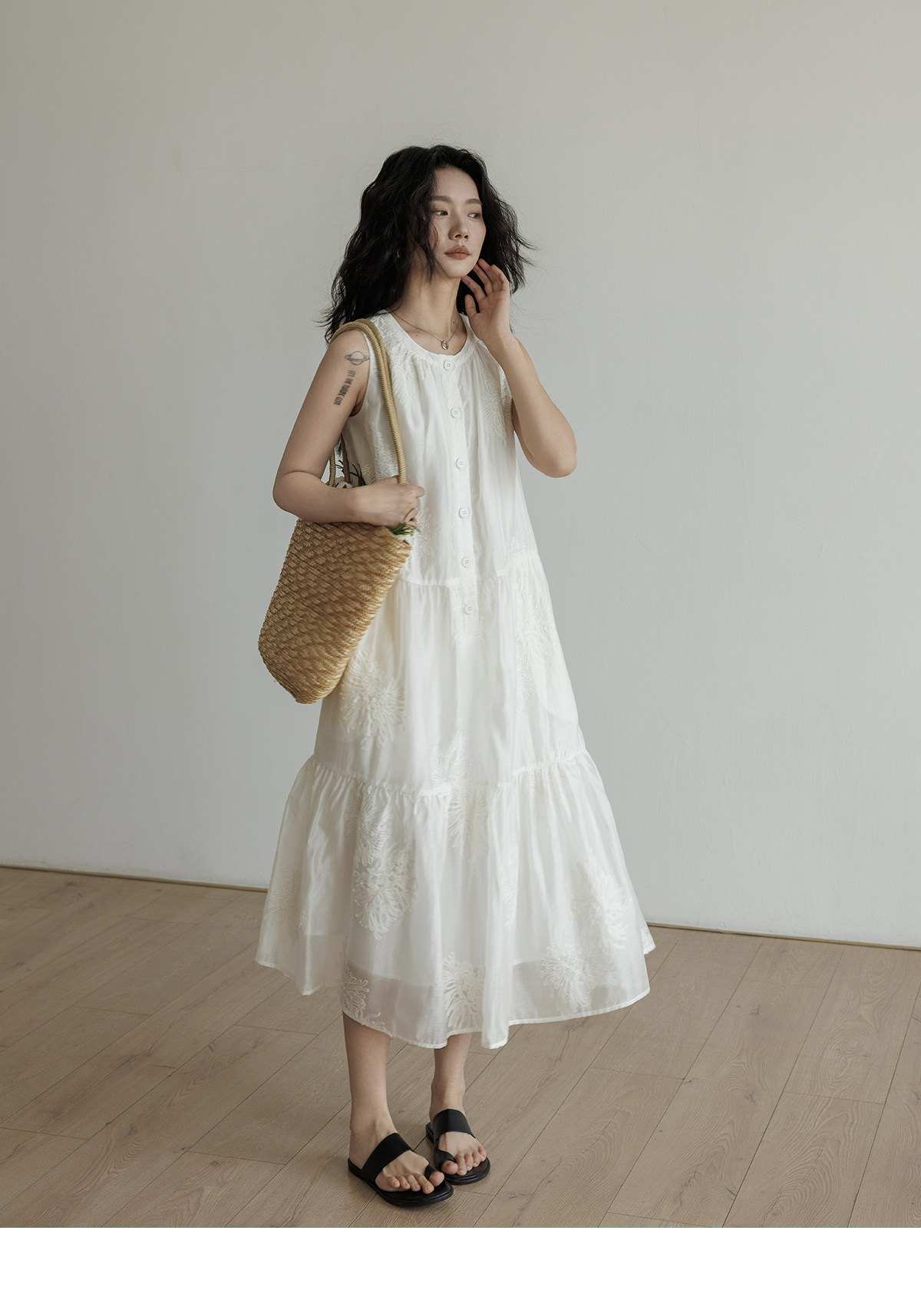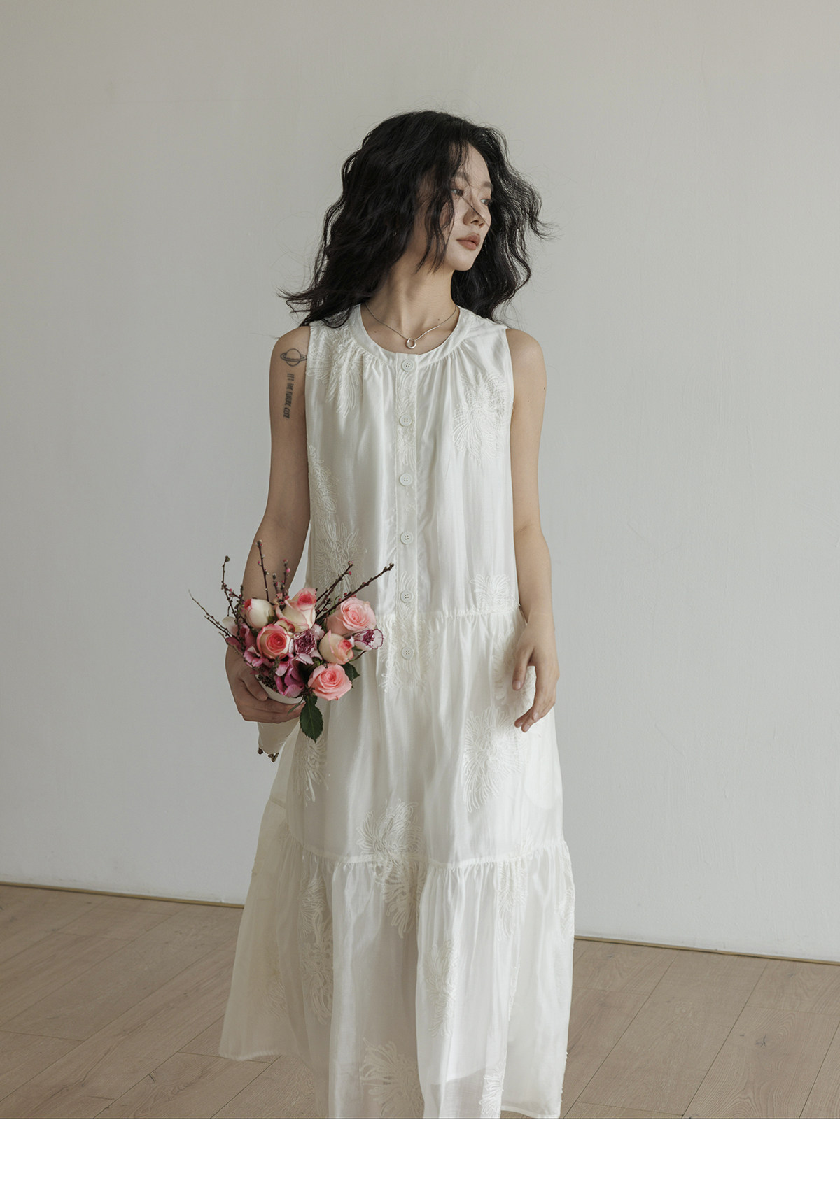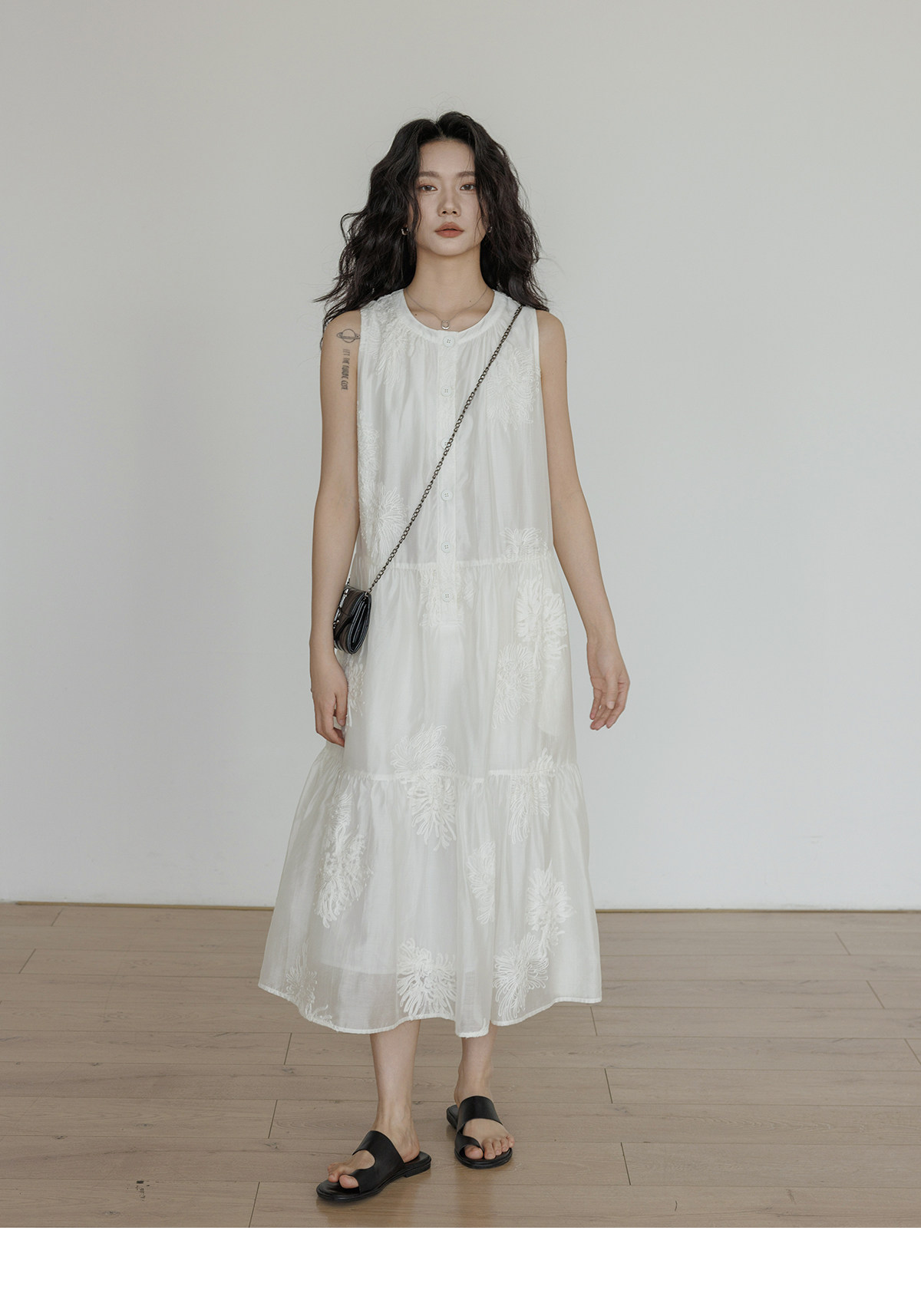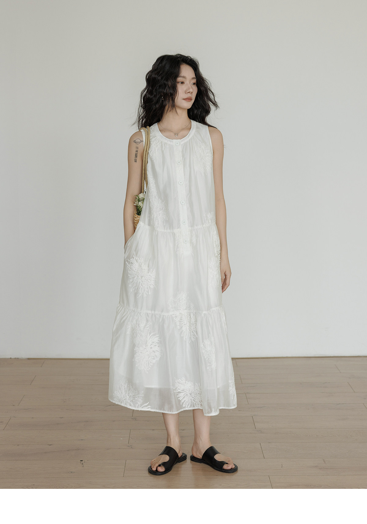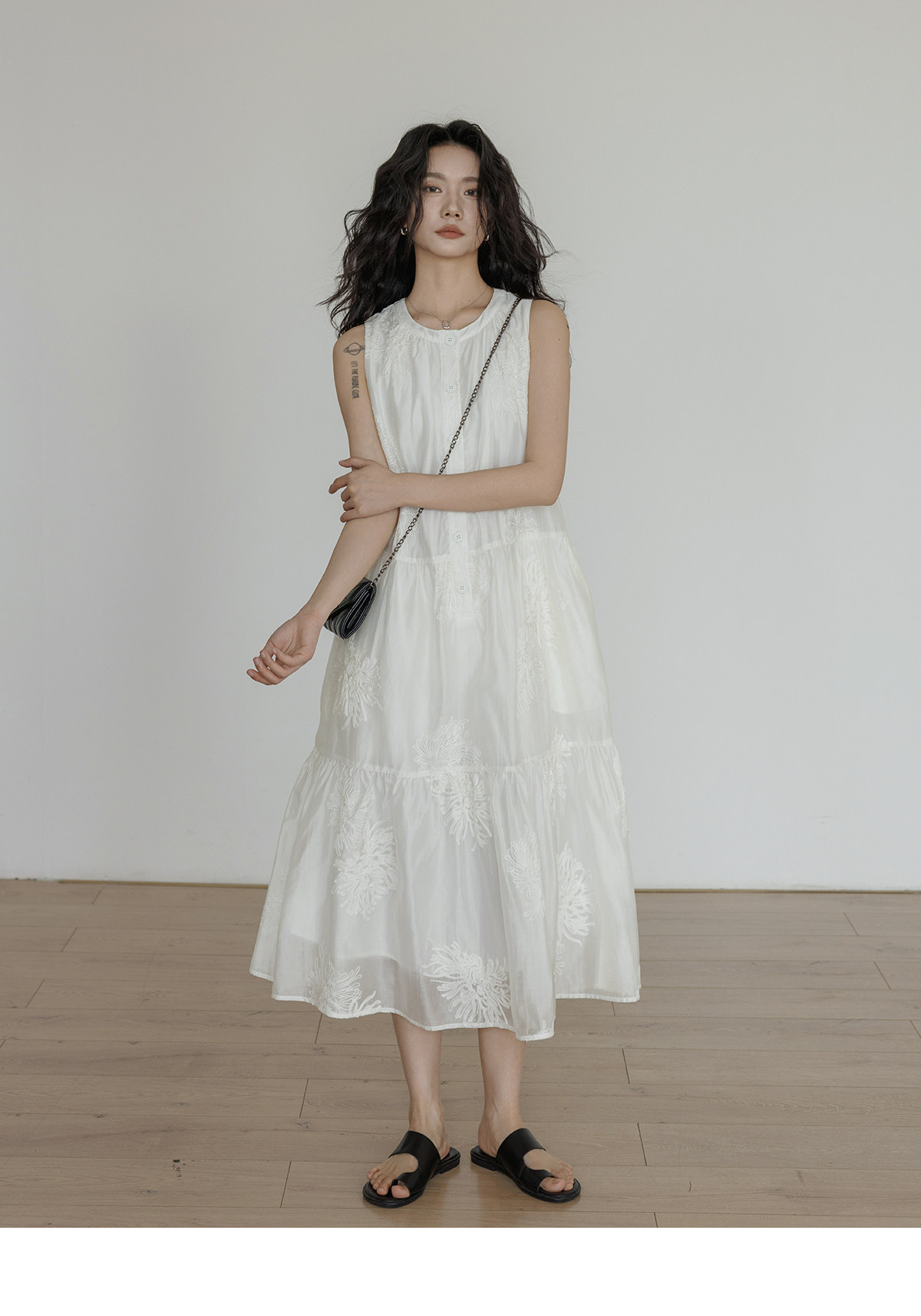 刺绣设计感新款慵懒宽松休闲度假长裙女圆领无袖背心连衣裙女