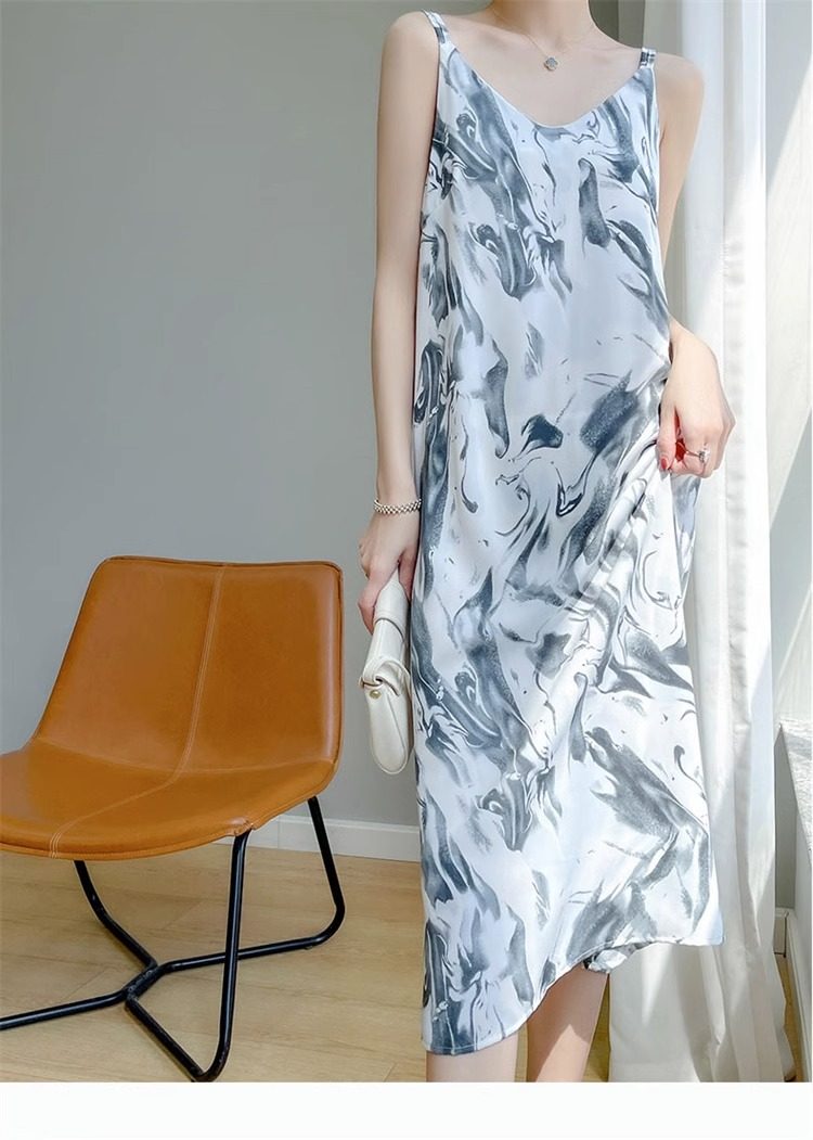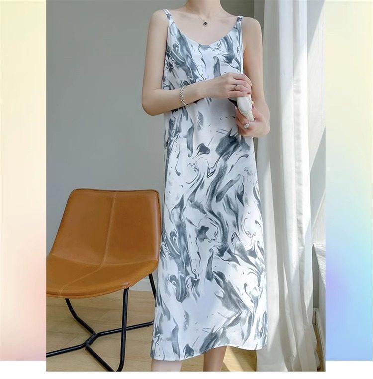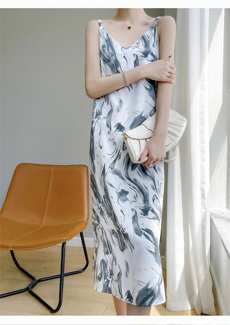 时尚夏季真丝拼色V领内搭连衣裙女士宽松吊带裙长裙百搭裙子